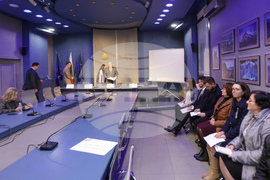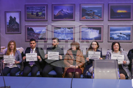 София (15 декември 2022) Пресконференция по актуални въпроси на министъра на външните работи Николай Милков. На пресконференцията присъстват и протестиращи служители от министерството. На снимката: от ляво надясно - Желязко Радуков, Костадин Коджабашев, Николай Милков, Хелия Иванова.