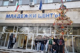 Хасково (15 декември 2022) Възпитаници на школата по етнография в "Младежки център" - Хасково изработиха и издигнаха на фасадата на центъра 8-метрова сурвачка. В традиционната инициатива преди коледните и новогодишни празници участваха над 50 деца от школата и от две професионални гимназии в града. Пресфото - БТА. снимка: Николай Грудев (ЕД)