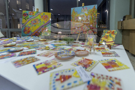 Габрово (15 декември 2022) Тази вечер с изложба бе отбелязана 16 годишнината на Детска школа за приложно изкуство „Ива Пенчева“. Събитието се състоя в зала „Възраждане“ в Габрово. Освен рисунките на децата в експозицията са подредени и картини рисувани на коприна. Пресфото-БТА снимка: Радослав Първанов (ЕД)