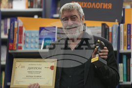 София (15 декември 2022) Престижната награда за нова българска проза „Хеликон“ бе връчена на официална церемония тази вечер. Носител е Костадин Костадинов за романа му „Ловецът на пеперуди“, (изд. „Хермес“). За наградата - паричен приз и пластика на бронзов орел - дело на скулптора и писател Евгений Кузманов се бориха 12 книги. Победителят бе обявен в книжарница „Хеликон Витоша“. На снимката: Михаил Вешим - председател на журито. Пресфото - БТА снимка: Цветомир Петров (ЕД)