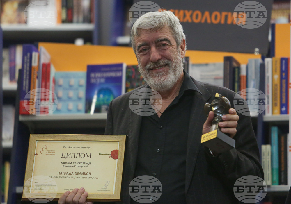 София (15 декември 2022) Престижната награда за нова българска проза „Хеликон“ бе връчена на официална церемония тази вечер. Носител е Костадин Костадинов (дясно) за романа му „Ловецът на пеперуди“, (изд. „Хермес“). За наградата - паричен приз и пластика на бронзов орел - дело на скулптора и писател Евгений Кузманов се бориха 12 книги. Победителят бе обявен в книжарница „Хеликон Витоша“. Наградата бе връчена за 21-и път, като миналата година неин носител стана Георги Тенев (ляво) за романа си „Резиденцията“. Пресфото - БТА снимка: Цветомир Петров (ЕД)