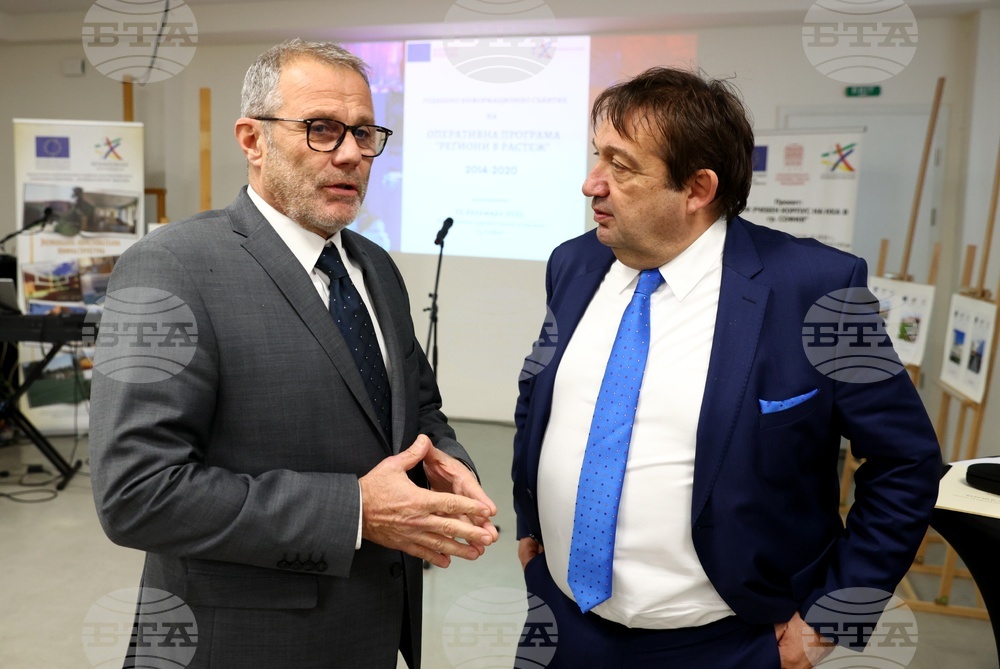 София (22 декември 2022) Министърът на регионалното развитие и благоустройството Иван Шишков откри Годишното информационно събитие на Оперативна програма "Региони в растеж" за 2022 г. Събитието се провежда в новия учебен корпус на Националната художествена академия. На снимката: ректорът на Националната художествена академия Проф. Георги Янков (вдясно).