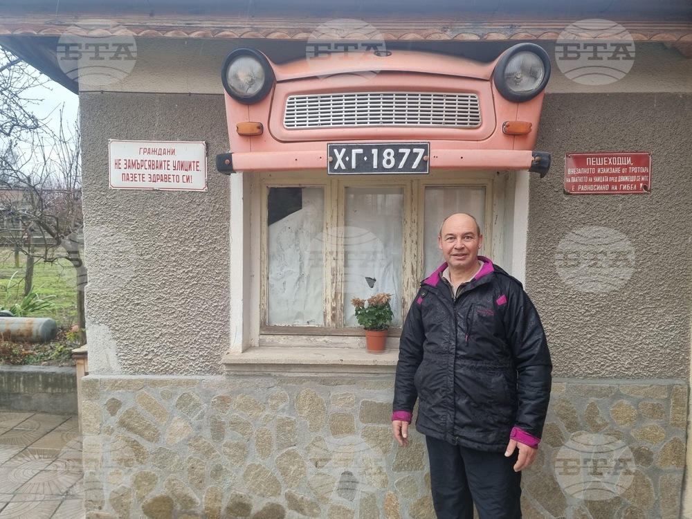 Село Белица (27 декември 2022) Банков служител направи своеобразен музей на автомобилната марка от бившата ГДР "Трабант" в дома си в село Белица, община Любимец. Георги Янакиев вече е събрал 13 коли втора употреба. Дори на фасадата на къщата му е окачена предница на немско возило с действащи клаксон и светлини. Пресфото-БТА Снимка: Николай Грудев (ЕД)