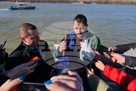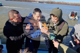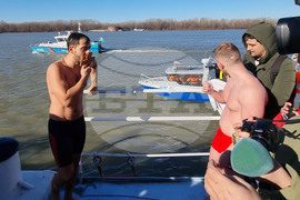 Русе (6 януари 2023) Йорданов ден бе честван в Русе. Двайсет и осем годишният Валентин Цветков извади кръста на Богоявление в Русе, хвърлен във водите на река Дунав от Русенския митрополит Наум. Общо 11 души се включиха в ритуала на Йордановден. Температурата на водата бе около шест градуса. Пресфото БТА Снимка: Бисер Тодоров (ЕД)