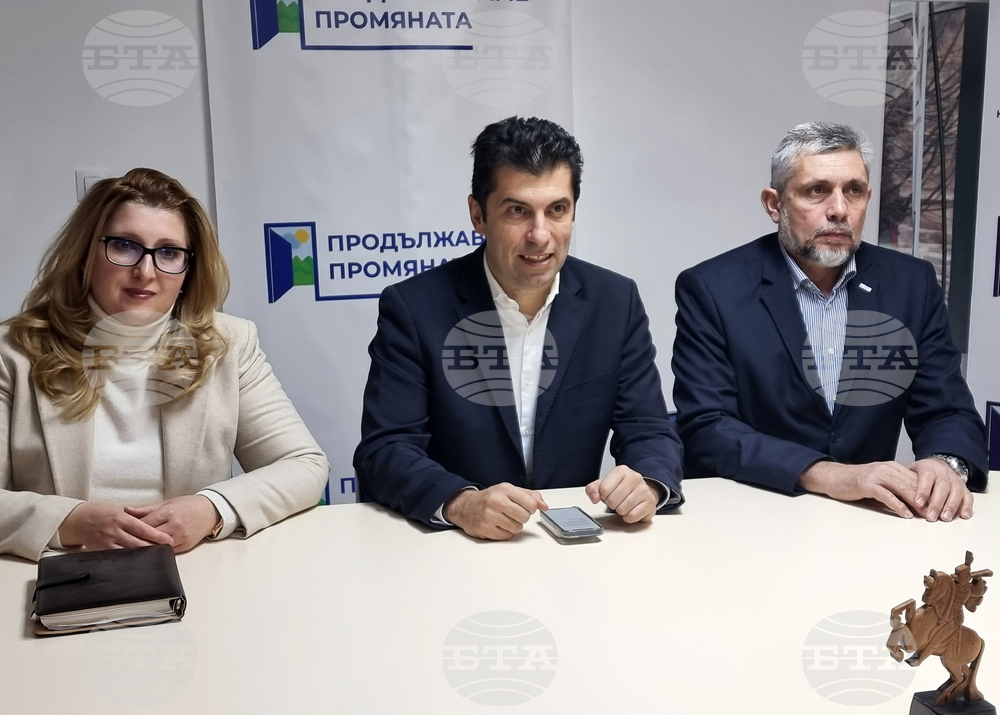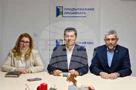 Сливен (16 януари 2023) Съпредседателя на „Продължаваме промяната” Кирил Петков даде пресконференция по актуални политически въпроси. На снимката от ляво надясно: Татяна Султанова народен представител от Сливен, съпредседателят на „Продължаваме промяната” Кирил Петков и Веселин Вълчев.