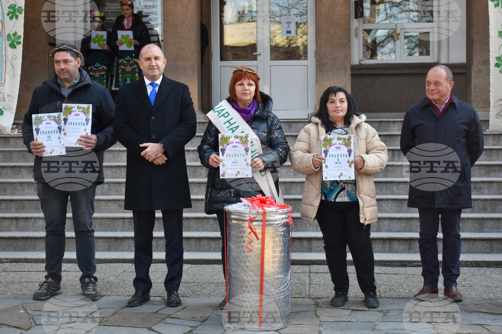 Село Устина (14 февруари 2023) Президентът Румен Радев награди победителите в конкурса на село Устина за „Най-добро домашно вино". Древната традиция повелява, че виното е искрата на живот, а друга повеля казва, че истински може да работи този, който знае как да се весели и уважава традициите, каза в приветствието си президентът. Той посочи, че празникът, посветен на лозарите и винарите, ни свързва хилядолетните традиции на предците. Хората чакат този ден цяла година и когато настъпи кулминацията на празника се отварят бъчвите, наливат се бъклиците, взимат се ножиците и се отправят към лозовите масиви, каза кметът на община „Родопи“ Павел Михайлов. Пресфото-БТА снимка: Боян Ботев (ЕД)