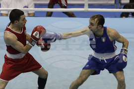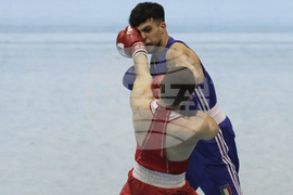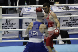 София (23 февруари 2023) В зала "София" се провежда 74-ото издание на Международния турнир по бокс за Купа „Странджа“. На снимката: Европейският вицешампион от миналата година Ергюнал Себахтин (червено) (48 кг) мач срещу италианеца Леонардо Еспозито.