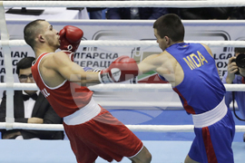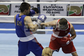 София (23 февруари 2023) В зала "София" се провежда 74-ото издание на Международния турнир по бокс за Купа „Странджа“. На снимката: Радослав Росенов (60 кг) (червен екип) срещу Виктор Вакула (Молдова).