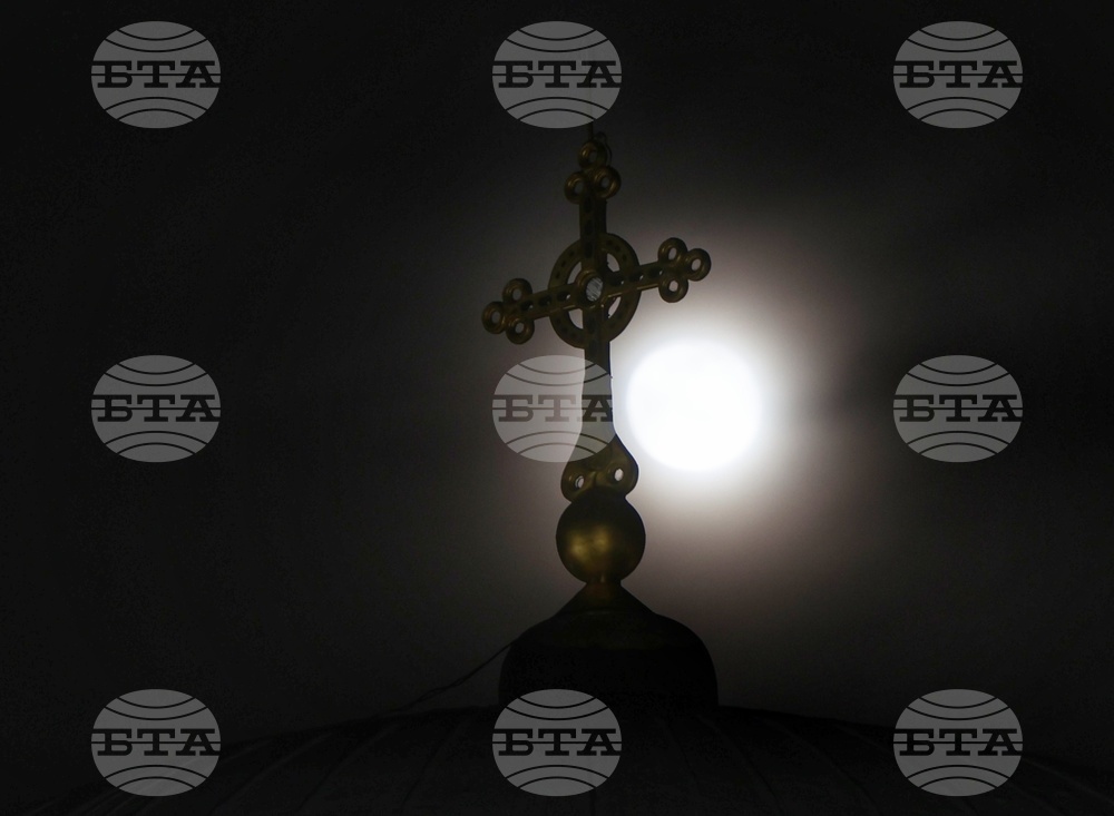 София (8 март 2023) Пълнолуние на фона на кръст на църквата „Свети Седмочисленици".