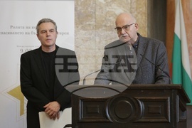 София (9 март 2023) В аулата на Ректората на Софийския университет „Св. Климент Охридски“ се провежда Международна конференция на тема: Ролята на юристите за спасяването на българските евреи. В конференцията участват български и чуждестранни учени и общественици. На снимката (от ляво надясно): архитект Станислав Константинов, скулпторът Красимир Ангелов.