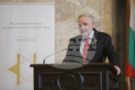 София (9 март 2023) В аулата на Ректората на Софийския университет „Св. Климент Охридски“ се провежда Международна конференция на тема: Ролята на юристите за спасяването на българските евреи. В конференцията участват български и чуждестранни учени и общественици. На снимката: посланикът на Държавата Израел Н.Пр. Йорам Елрон (в средата).