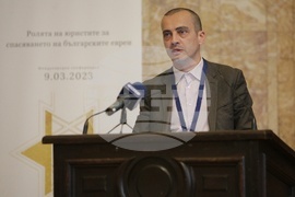 София (9 март 2023) В аулата на ректората на Софийския университет „Св. Климент Охридски“ се провежда Международна конференция на тема: Ролята на юристите за спасяването на българските евреи. В конференцията участват български и чуждестранни учени и общественици. На снимката: дтн. Максим Бенвенисти.
