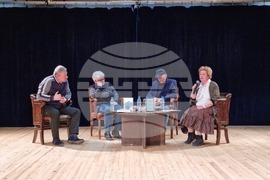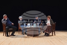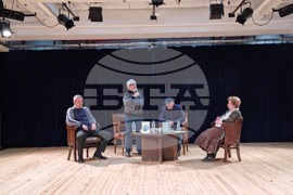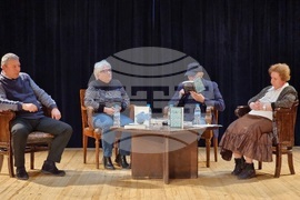 София (23 март 2023) Снощи в Театралната зала на Софийски университет бяха представени две книги на писателя и поет Палми Ранчев. Това са стихосбирката му с избрана поезия „Под шапката на скитника - подреждане на уличните безпокойства” (Изд. Scribens) и романът му „Хаосът в играта на джаги” (Изд. „Жанет 45”). Освен автора, в премиерата участваха още писателят Митко Новков, поетесата Силвия Чолева и литературоведът Росица Чернокожева. На снимката (от ляво надясно): Митко Новков, Силвия Чолева, Палми Ранчев и Росица Чернокожева. Снимка: Яница Христова/БТА (EД)