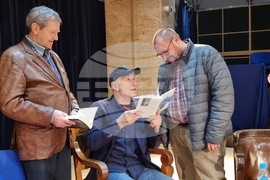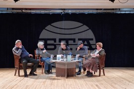 София (23 март 2023) Снощи в Театралната зала на Софийски университет бяха представени две книги на писателя и поет Палми Ранчев. Това са стихосбирката му с избрана поезия „Под шапката на скитника - подреждане на уличните безпокойства” (Изд. Scribens) и романът му „Хаосът в играта на джаги” (Изд. „Жанет 45”). Освен автора, в премиерата участваха още писателят Митко Новков, поетесата Силвия Чолева и литературоведът Росица Чернокожева. На снимката (от ляво надясно): писателят Боян Биолчев, Палми Ранчев и Светлозар Желев. Снимка: Яница Христова/БТА (EД)