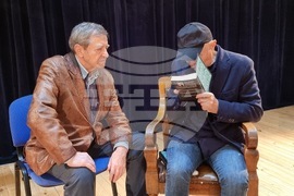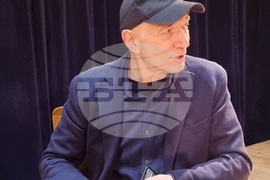София (23 март 2023) Снощи в Театралната зала на Софийски университет бяха представени две книги на писателя и поет Палми Ранчев. Това са стихосбирката му с избрана поезия „Под шапката на скитника - подреждане на уличните безпокойства” (Изд. Scribens) и романът му „Хаосът в играта на джаги” (Изд. „Жанет 45”). Освен автора, в премиерата участваха още писателят Митко Новков, поетесата Силвия Чолева и литературоведът Росица Чернокожева. На снимката: писателят Боян Биолчев (ляво). Снимка: Яница Христова/БТА (EД)
