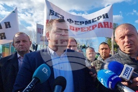 Видин (29 март 2023) Зърнопроизводители от Северна България и земеделци от Румъния, както и от фермери от всички сектори на селското стопанство в региона излязоха от днес на тридневен протест. Те блокираха международния път Е-79 на входа на Видин за 15 минути - от 10:30 до 10:45. Да подкрепи стачните им действие на място дойде министърът на земеделието Явор Гечев (ляво).