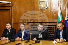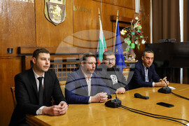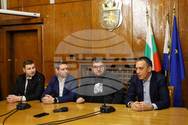 Бургас (5 април 2023) В заседателната зала на Община Бургас се провежда пресконференция по повод реализацията на съвместна кампания между Сдружение „Младите лекари" и Община Бургас, за профилактика, превенция и промоция на здравето сред жителите на града. В събитието участват представители на сдружение „Младите лекари" председателят на сдружението д-р Стамен Пишев, заместник председателят д-р Диян Господинов, секретарят на сдружение „Младите лекари" д-р Павел Минев и членове на Управителния съвет. От страна на Общината кметът Димитър Николов, заместник-кметът по образование, здравеопазване и социални дейности Йорданка Ананиева. На снимката от ляво надясно: д-р Павел Минев, д-р Стамен Пишев, д-р Диян Господинов и кметът на Община Бургас Димитър Николов.