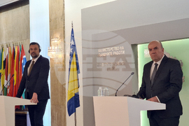 София (12 април 2023) Министърът на външните работи Николай Милков (дясно) проведе среща с министъра на външните работи на Босна и Херцеговина Елмедин Конакович, който е на официално посещение у нас. На снимката: След срещата министрите дават съвместна пресконференция. Снимка: Елена Николова/БТА (ЕД)