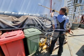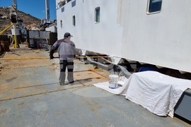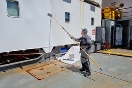 Същевременно членовете на екипажа от палубната команда освежиха с пресен слой бяла боя жилищния модул на кораба, димоходите и стойките за спасителните плотове. Съставът на корабната боя е такъв, че да запазва повърхностните площи колкото се може по-дълго от ръжда и корозия, които са неизбежни в морски условия.