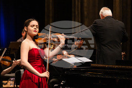 Бургас (10 май 2023) В Държавна опера Бургас се провежда Симфоничен концерт с участието на възпитаници на Национално училище за музикално и сценично изкуство "Проф. Панчо Владигеров" Бургас. Диригент е Йордан Дафов, а концертмайстор Ваня Златева. На снимката: Милана Кан.