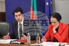 София (11 май 2023) В Министерски съвет се провежда публична дискусия на тема „Открито управление – цел и фокус на доброто управление“. На снимката (от ляво надясно): заместник министър-председателят по управление на европейските средства Атанас Пеканов и програмният директор на Български център за нестопанско право Надя Шабани.