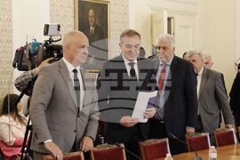 София (11 май 2023) Номинираната от ГЕРБ-СДС за министър-председател Мария Габриел и представители ГЕРБ-СДС провеждат среща с представители на БСП в сградата на Народното събрание. На снимката (от ляво надясно): Георги Свиленски, Борислав Гуцанов, Румен Гечев.
