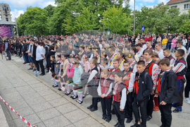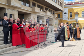 Шумен (11 май 2023) Пред сградата на общинската администрация в града се отбелязва Денят на Шумен - 11 май с церемония по издигане на знамената на България, на Европейския съюз и на Шумен. За празника е представен специално подготвен спектакъл за буквите и книжовността. На снимката: молебен за мир и благоденствие на Шумен и жителите му отслужва архиерейският наместник отец Димитър и местен свещеник.