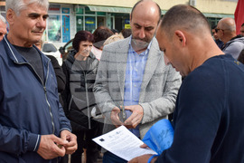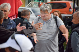 Кресна (15 май 2023) В Кресна се провежда протест във връзка с отсечката на АМ „Струма“ през Кресненското дефиле, чието строителство все още не е започнало. Протестиращите изразиха желание магистралата да бъде изградена изцяло извън Кресненското дефиле. На снимката (е дясно): еколога Андрей Ковачев.