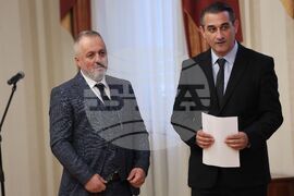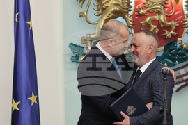 София (19 май 2023) На церемония в Гербовата зала на „Дондуков" 2 президентът Румен Радев (ляво) връчва български документи за самоличност на председателя на закрития от властите в Република Северна Македония български културен център „Иван Михайлов“ в Битоля Любчо Георгиевски (дясно) и на Благой Шаторов – секретар на центъра.