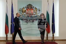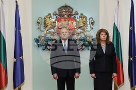 София (19 май 2023) На церемония в Гербовата зала на „Дондуков" 2 президентът Румен Радев връчва български документи за самоличност на председателя на закрития от властите в Република Северна Македония български културен център „Иван Михайлов“ в Битоля Любчо Георгиевски и на Благой Шаторов – секретар на центъра. На снимката (от ляво надясно): държавният глава Румен Радев и вицепрезидентът Илияна Йотова.