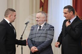 София (19 май 2023) На церемония в Гербовата зала на „Дондуков" 2 президентът Румен Радев връчва български документи за самоличност на председателя на закрития от властите в Република Северна Македония български културен център „Иван Михайлов“ в Битоля Любчо Георгиевски (ляво) и на Благой Шаторов (в средата) – секретар на центъра. На събитието присъства и секретарят на българския клуб в Охрид Християн Пендиков (дясно).