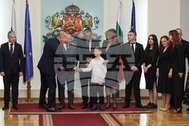 София (19 май 2023) На церемония в Гербовата зала на „Дондуков" 2 президентът Румен Радев връчва български документи за самоличност на председателя на закрития от властите в Република Северна Македония български културен център „Иван Михайлов“ в Битоля Любчо Георгиевски и на Благой Шаторов – секретар на центъра. На снимката: министърът на външните работи Иван Кондов (трети отляво), държавният глава Румен Радев (четвърти отляво), Любчо Георгиевски (пети отляво), Благой Шаторов (шести отляво), вицепрезидентът Илияна Йотова (в средата), Християн Пендиков (шести отдясно).