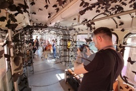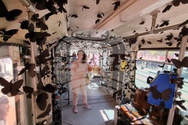 Тимишоара (22 май 2023) Нестандартна трамвайна обиколка предлагат в Тимишоара - европейска столица на културата. Гостите и жителите на румънския град имат възможност да го обиколят със стар трамвай, целият покрит с черни пеперуди. Идеята е на мултидисциплинарния мексикански художник Карлос Аморалес. Снимка: Мартина Ганчева/БТА (ПБ)