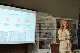 София (22 май 2023) На пресконференция е залата на Столичната община на ул. "Париж" 1 беше представен проект "Слънчеви градове" (SOLAR CITIES), който се финансира от Европейската инициатива за климата (EUKI). Беше дадена информация за най-новото проучване за потенциала на слънчевата енергия на над 2000 сгради за производство на електричество от възобновяеми източници. На снимката: Зам.-кметът на Столичната община Десислава Билева.