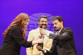 Наградите са единствени по рода си театрални награди в България, при които отличията се дават от артисти за артисти“ и всяко от тях е професионален и естетически избор на хора, правещи театър. БТА е основен медиен партньор. На снимката: Иван Радоев Стефка Янорова (вдясно) връчиха наградата За поддържаща женска роля на Мария Каварджикова за ролята й на Магдалена в „Частици жена“ от Ката Вебер (Народен театър), наградата прие нейната дъщеря (вляво).