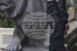 София (26 май 2023) Служител на жандармерията охранява пред сградата на МВР, където служебният министър на вътрешните работи направи изявление за медиите.