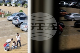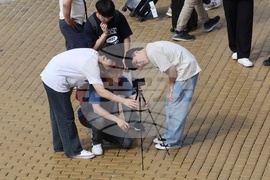 София (8 юни 2023) Туристи от азиатски произход се снимат на жълтите павета пред сградата на Народното събрание.