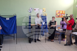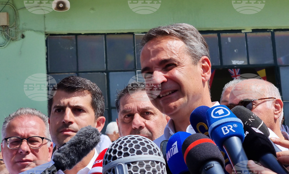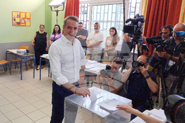 Атина (25 юни 2023) Лидерът на дясноцентристката гръцка партия Нова демокрация Кириакос Мицотакис гласува на днешните парламентарни избори в атинския квартал Кифися.