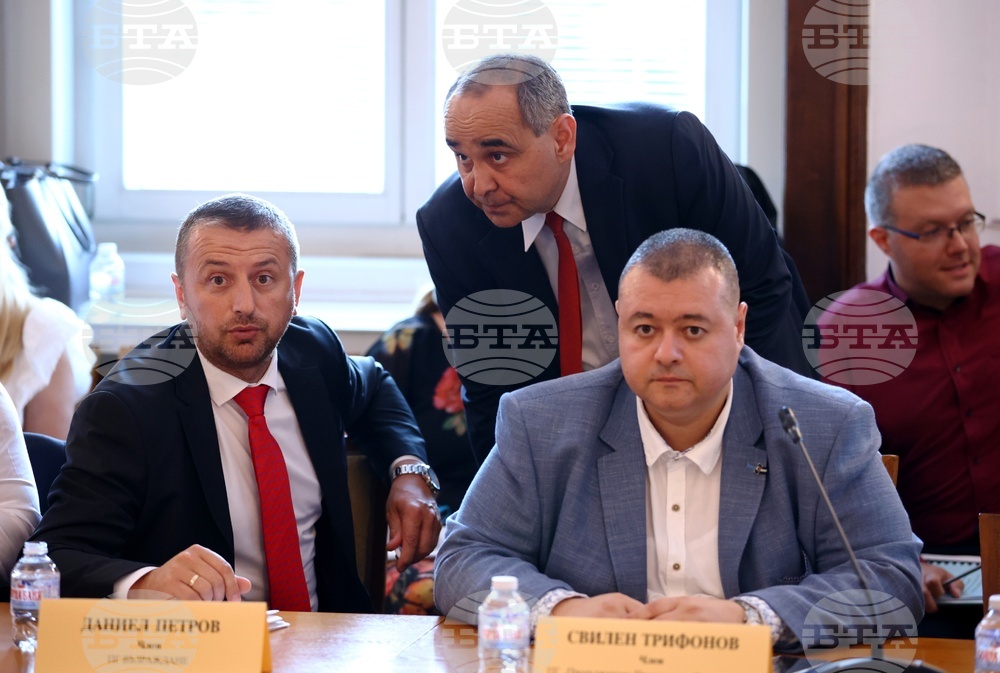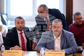 София (5 юли 2023) Комисията по земеделието, храните и горите провежда заседание в сградата на Народното събрание. На снимката (от ляво надсно): Даниел Петров, Росен Костурков и Свилен Трифонов.