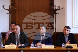 София (5 юли 2023) Комисията по земеделието, храните и горите провежда заседание в сградата на Народното събрание. На снимката (от ляво надясно): заместник министрите на земеделието и храните Деян Стратиев и Мирослав Маринов и Светослав Казаков.