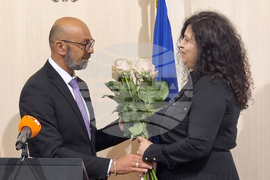 Варна (27 юли 2023) Новият областен управител на област с административен център Варна доц. Андрияна Андреева (дясно) официално встъпи в длъжност. На церемония в сградата на областна администрация тя прие поста и печата от досегашния областен управител Марио Смърков (ляво).