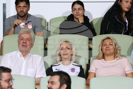 Село Бистрица (21 август 2023) Валентин Михов и психологът Лилия Стефанова (в средата) присъстват на стадион „Витоша", където се играе футболна среща между отборите на ЦСКА 1948 и Етър.
