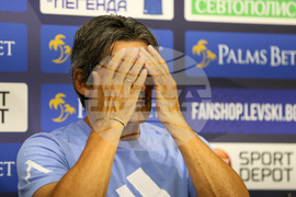 София (23 август 2023) Треньорът на ПФК „Левски“ Николай Костов (на снимката) и капитанът на тима говорят пред медиите на Националния стадион „Васил Левски" - ден преди първия мач с Айнтрахт Франкфурт от плейофите на Лигата на конференциите.