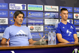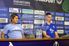 София (23 август 2023) Треньорът на ПФК „Левски“ Николай Костов (ляво) и капитанът на Андриан Краев говорят пред медиите на Националния стадион „Васил Левски" - ден преди първия мач с Айнтрахт Франкфурт от плейофите на Лигата на конференциите.