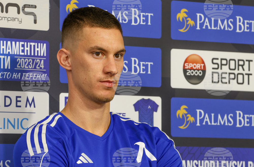 София (23 август 2023) Треньорът на ПФК „Левски“ и капитанът Андриан Краев (на снимката) говорят пред медиите на Националния стадион „Васил Левски" - ден преди първия мач с Айнтрахт Франкфурт от плейофите на Лигата на конференциите.