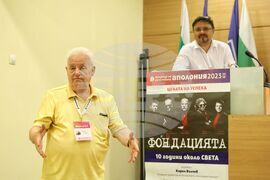 Созопол (5 септември 2023) Супергрупата Фондацията провежда среща разговор с генералния директор на Българска Телеграфна Агенция Кирил Вълчев (дясно) в сградата на Народно читалище "Отец Паисий 1896". На срещата се представя и новият брой на списание ЛИК, който е посветен на 10 годишнината на групата. Срещата е част от дискусионния формат "Цената на успеха" и е част от празниците на изкуствата "Аполония" 2023. На снимката: журналистът, генерален директор на БТА в периода 1997-2002 г. Панайот Денев (ляво).