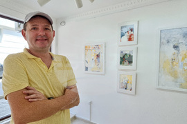 Варна (14 септември 2023) Художникът Стефан Кулев (на снимката) се представя за втори път със самостоятелна изложба в Арт галерия „Ларго“. Той показва 33 живописни платна, рисувани това лято специално за изявата му в родния му град, обединени от заглавието „Брегове“. В пигментите той вплита натурални материали, събирани от него по Северното Черноморие, където обича да се гмурка.