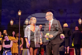 София (1 октомври 2023) Премиера на политическо сатирично кабаре „Долу народа!“ в Сатиричния театър. На снимката: Александра Сърчаджиева и Калин Сърменов.