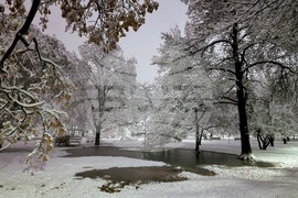 София (26 ноември 2023) Нощни снимки от обилните снеговалежи в столицата (района около парк св. Троица) показват множество паднали дървета от натрупалия мокър сняг.