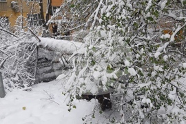 София (26 ноември 2023) Паднали дървета ограничават движението в столичния квартал „Толстой". Под тежестта на снега много клони и дървета са се привели.